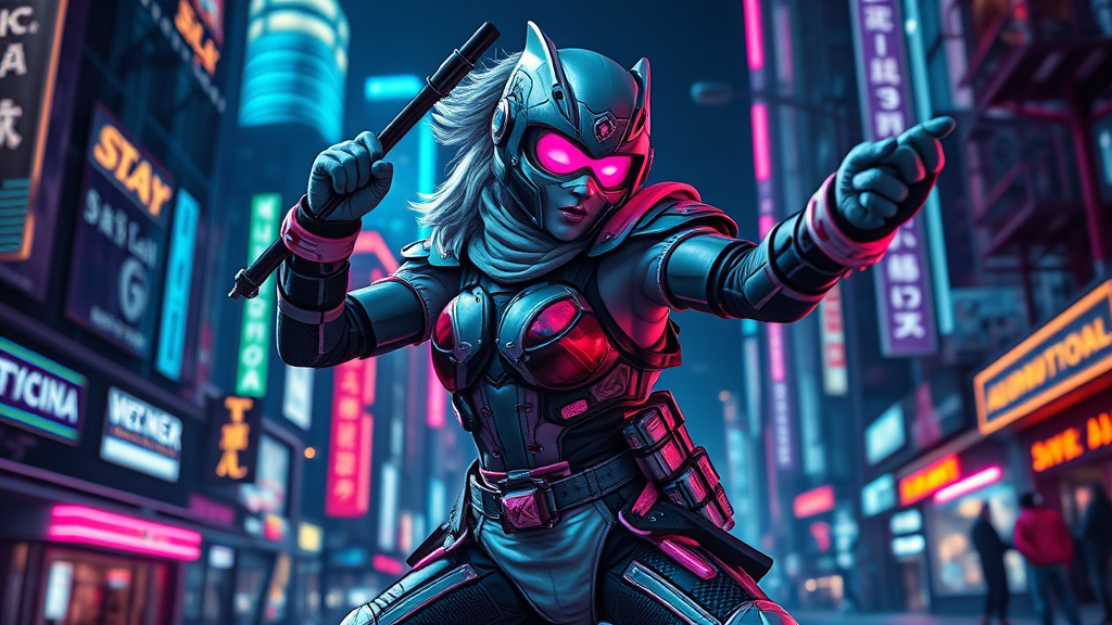 Grandma warrior in a futuristic cybercore battle outfit, striking an action-packed dynamic pose, full body shot against a backdrop of vibrant blacklight cityscape at night, captured with hyper-realistic detail, showcasing intricate textures and colors, 8k resolution, emphasizing the contrast of neon lights and shadows.
