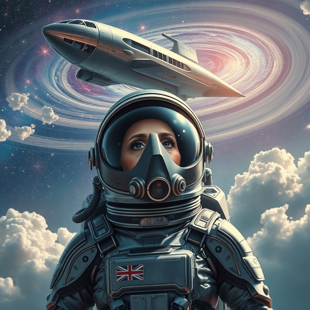 Grandmother astronaut in a futuristic space suit stands beneath an alien sky, the visor and respirator reflecting distant galaxies. A sleek spaceship hovers overhead, its metallic surface reminiscent of a stainless steel rat. The scene captures superfine detail, echoing the style of Eddie Jones cover art, with creative nuances like swirling cosmic clouds and twinkling stars enhancing the serene yet adventurous atmosphere.