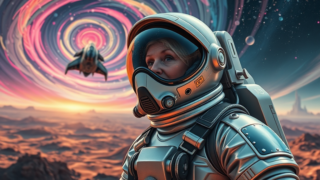 Grandmother astronaut in high-tech space suit, exploring alien landscapes beneath a swirling alien sky, futuristic spaceship looms above, visor reflecting vibrant cosmic colors, respirator integrated into sleek design, dramatic low-angle view highlighting intricate suit details, stainless steel aesthetic reminiscent of Eddie Jones cover art, inspired by the adventurous spirit of Harry Harrison’s stories.