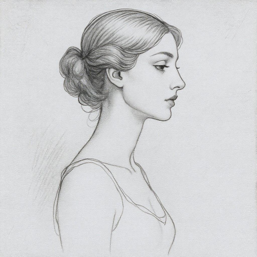 Graphite pencil sketch, elegant, female profile, serene beauty, soft lines, inspired by the works of Odilon Redon, minimalistic charm, elongated features, gentle shading, timeless allure, quiet strength, vertical composition.