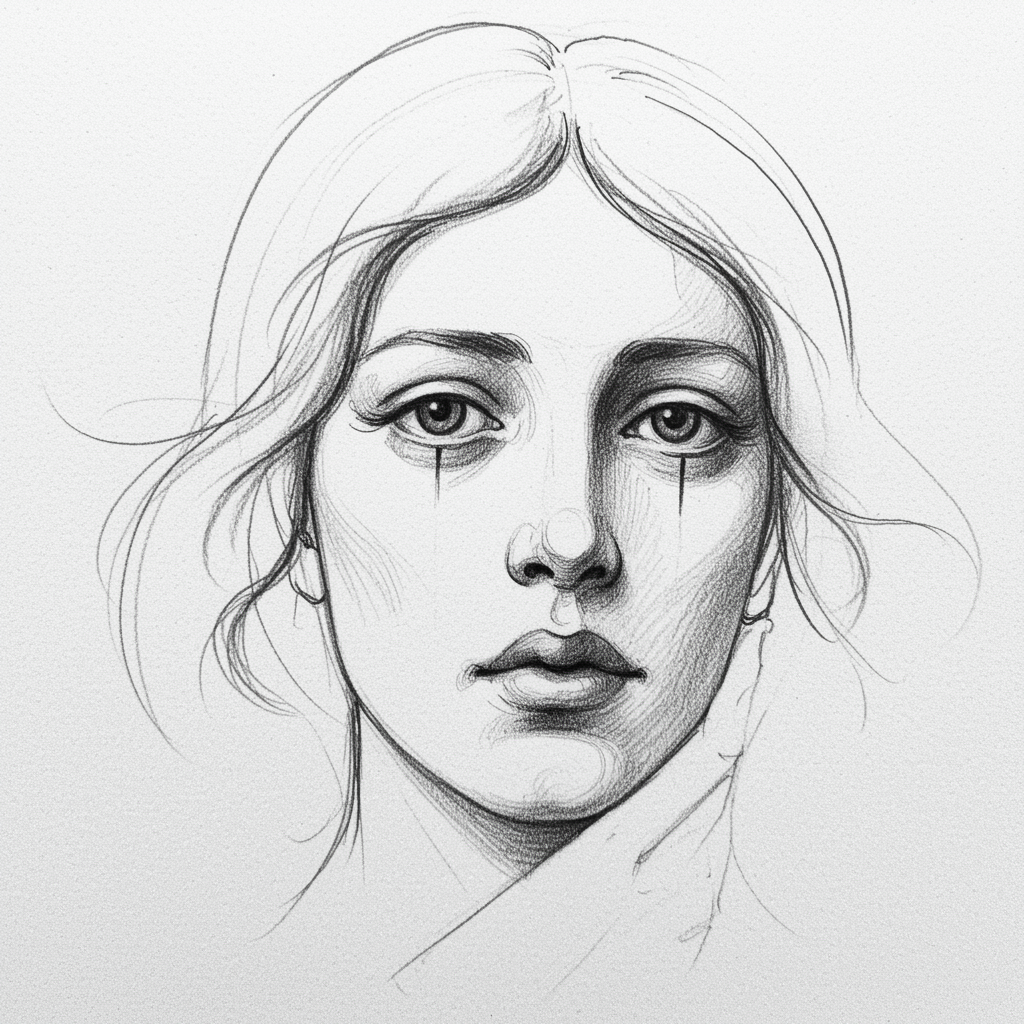 Graphite pencil sketch, minimalist, feminine visage, inspired by Odilon Redon, with subtle creative twists, maintaining the essential theme, slight abstract influence, delicate lines, evocative expression, understated elegance.