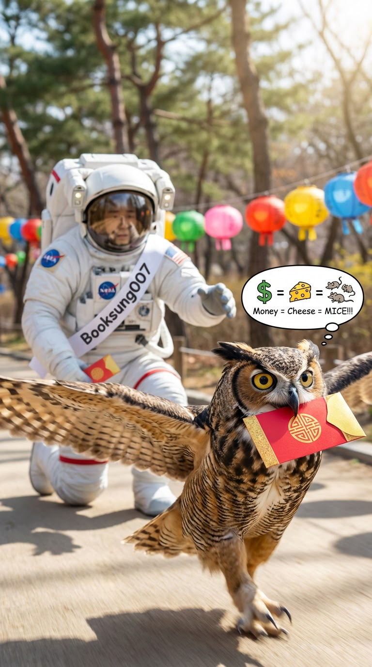 On the first and second image you can see Hooh - a large pet great horned owl. On the third - Hooh with a realistic astronaut. I want to make another pic with this owl and that astronaut (astronaut has sash, sash says “Booksung007”) A photorealistic, absurdly wholesome scene. A bright, sunny day in a park with traditional Korean decorations (colorful lanterns) for Seollal. In the foreground, the majestic Great Horned Owl, Hooh, is sprinting away at full speed (with motion blur, she is running really fast, especially for owl) with pure, unhinged joy. In her beak, she clutches a bright, colorful sebaetdon envelope (traditional Lunar New Year money pouch). In the blurry background, an astronaut in a bulky, realistic white NASA-style spacesuit (the one from image 3) is still crouched down, one hand extended from where they just gave the money, completely frozen in confusion. A speech bubble above Hooh's head, mid-run, reads: "Money = Cheese = MICE!!!" in small toon pictures. Her eyes are wide with greedy delight, feathers ruffled from the sudden sprint. She is looking past viewer. Utilize motion blur to emphasize how fast she is running.