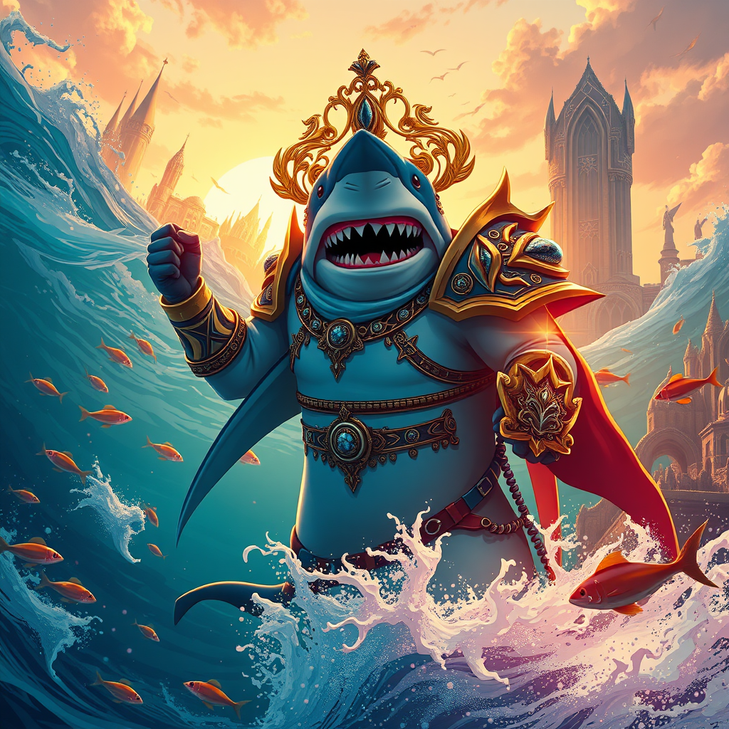 Great white shark superhero adorned in elaborate ornate armor standing proudly in the majestic city of Atlantis, vibrant cinematic movie poster style, surrounded by a dynamic scene of swirling water and fish in the background. The setting is dawn, casting a warm glow over the scene, reminiscent of anime and manga graphics with vivid colors and high detail. Designed for offset printing, the composition is in HD, 8K quality, using CMYK colors and featuring joyful, atmospheric lighting.