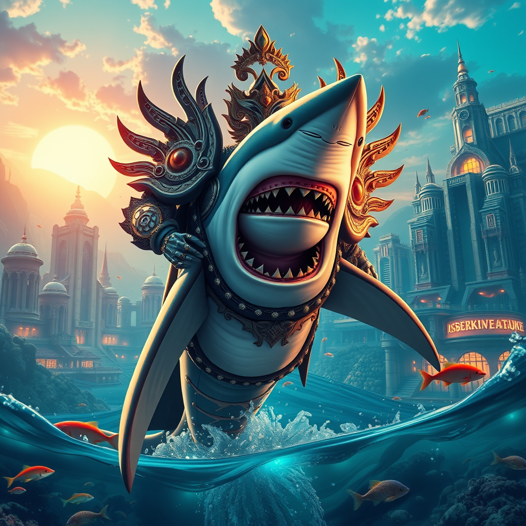 Great white shark superhero clad in elaborate ornate armor towering in the majestic cityscape of Atlantis, cinematic movie poster style, immersive water and colorful sea life backdrop illuminated by the soft glow of dawn, vibrant anime and manga-inspired graphics, dynamic composition using bright colors, offset printing aesthetic, meticulously detailed, 8K HD resolution in CMYK, exuding a sense of joy and triumph, featuring dramatic cinematic lighting, portrait orientation with an aspect ratio of 9:16.