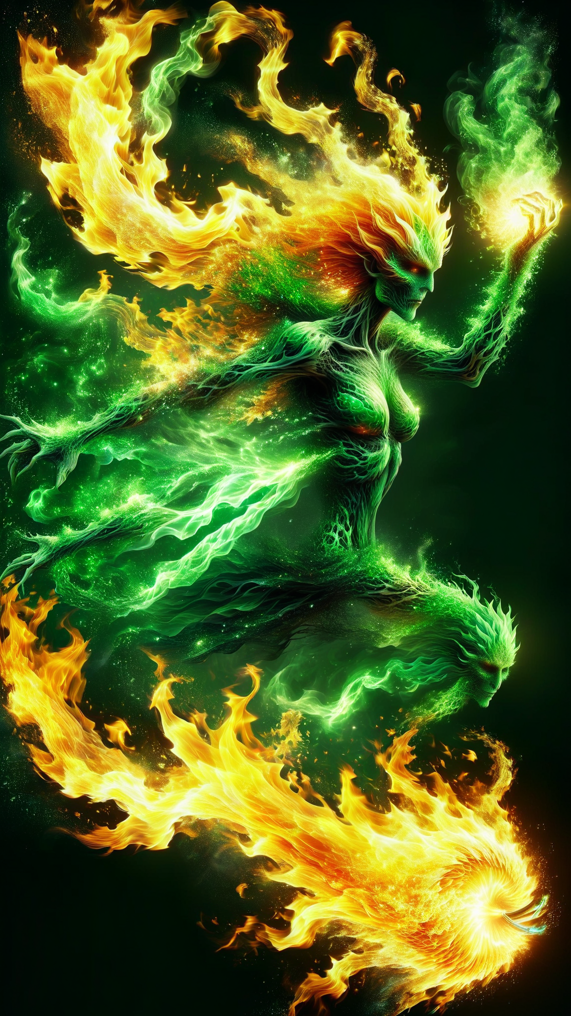 Green fire, elemental force of nature. A fire spirit that takes the form of rapidly spinning green flames. Other times, it is spinning green sparks. Seldomly, you csn see a humanoid figure made of flames or spsrks within the whirling energy; the humanoid form is created by them. It has no actual form of its own. Faerie without a form.