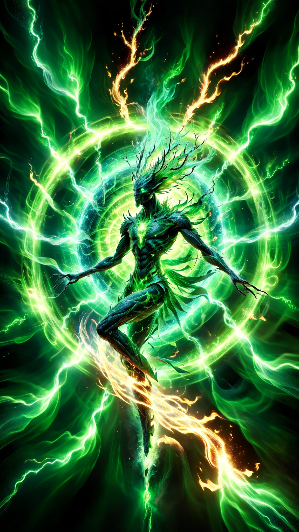 Green fire, elemental force of nature. A fire spirit that takes the form of rapidly spinning green flames. Other times, it is spinning green sparks. Seldomly, you csn see a humanoid figure made of flames or spsrks within the whirling energy; the humanoid form is created by them. It has no actual form of its own. Faerie without a form.