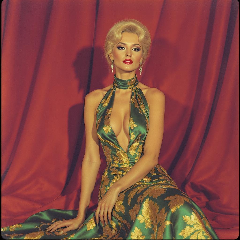 A woman in an emerald green halter neck dress elegantly poses for a picture, capturing the essence of a colorized vintage photo infused with Richard Avedon's style. The dress is a luxurious blend of gilded floral patterns and soft silk, gently hugging her figure with a low-cut neckline. The image evokes the nostalgic yet modern aesthetic of a Tumblr mood board, set against a backdrop that complements the vivid tones of her attire. Her graceful posture and the rich texture of the fabric highlight the allure of timeless fashion photography.