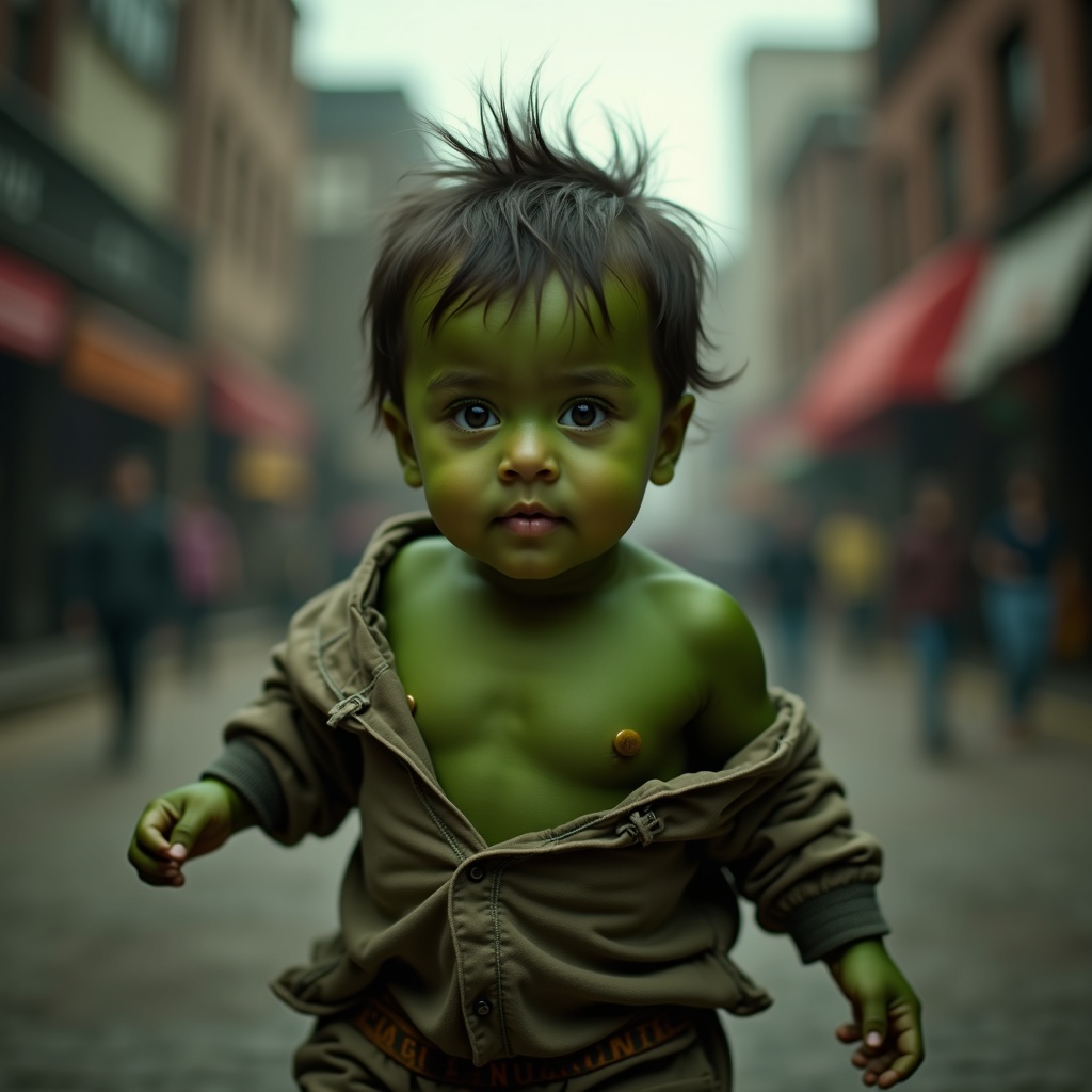 A toddler with vibrant green skin and muscular build stands amidst a bustling cityscape, his expressive eyes wide with curiosity and mischief, the torn remnants of a tiny shirt fluttering behind him, capturing the cinematic blend of innocence and untamed power as he explores his surroundings with wonder.