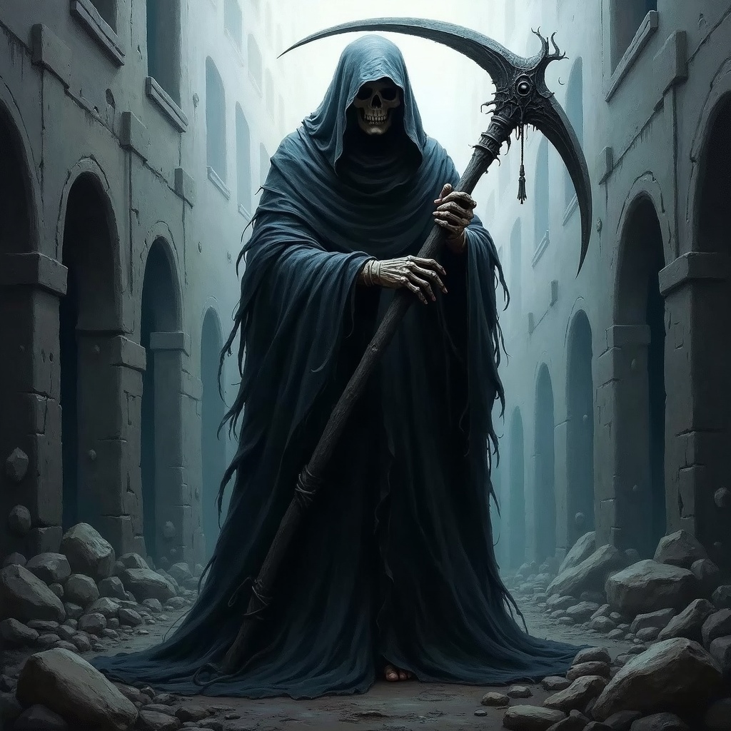 A chilling full-body portrait of the Grim Reaper, cloaked in tattered dark robes and holding a large scythe, stands amidst a desolate, ruined city. The scene evokes a somber and eerie mood with its monochromatic palette and ghostly glow.