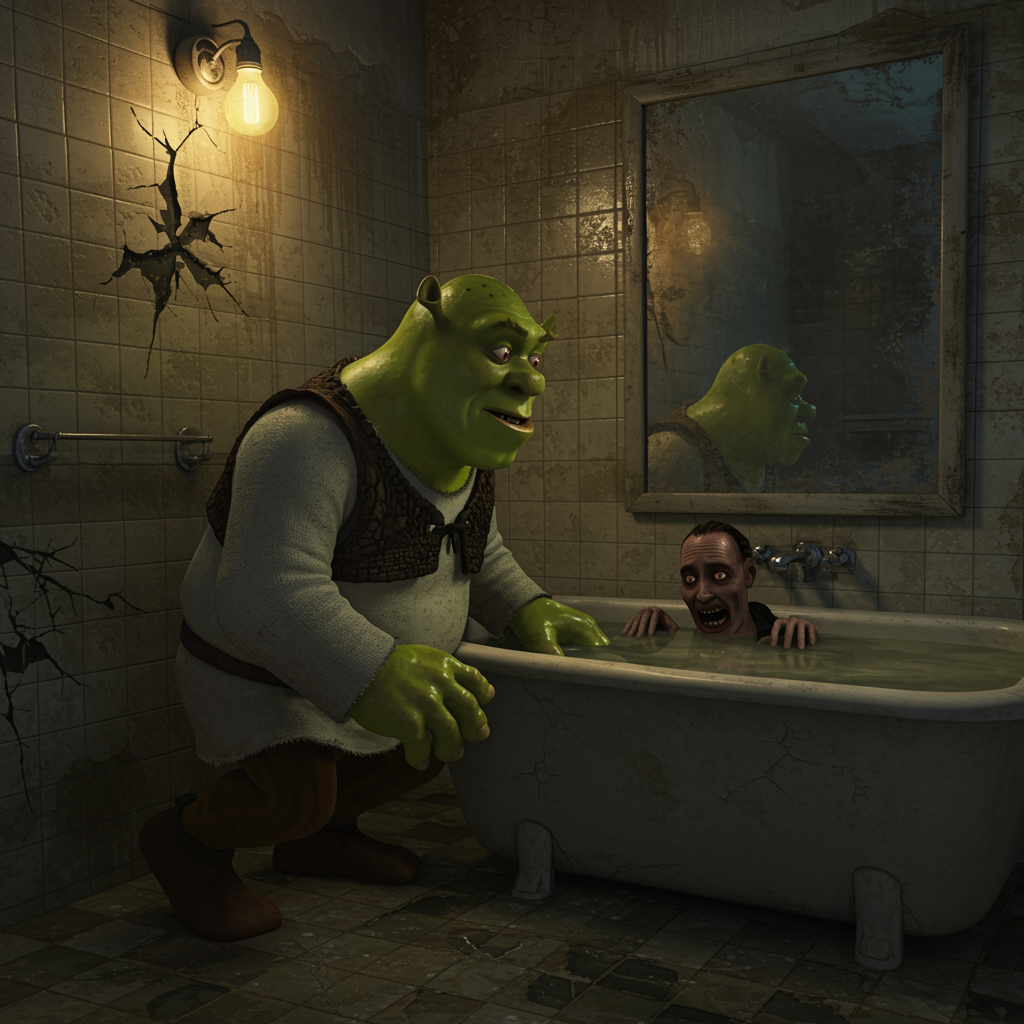 In an old, grimy bathroom of an abandoned house, Shrek, his skin slick with slime and eyes bloodshot, crouches beside an ominous figure peeking out from a bathtub filled with murky water. The tiles around them are cracked, and the mirror is fogged and speckled with mildew. A flickering bulb provides the only light, casting unsettling shadows, and the distorted reflections of both characters in the mirror add to the chilling, horror-laden atmosphere.