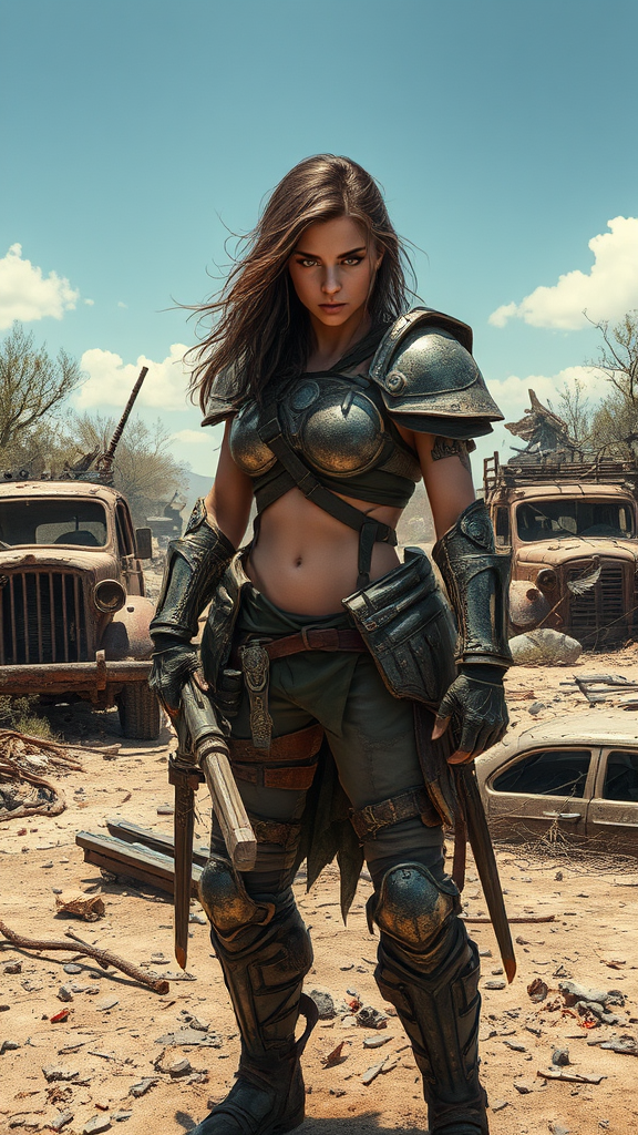 Gritty and fierce female warrior stands amidst a desolate wasteland, her battle-worn armor reflecting the harsh sun; remnants of a devastated civilization scatter around her, while she grips a makeshift weapon with determination; her piercing eyes scan the horizon for danger, hinting at a resilient spirit in a chaotic landscape; background features rusted vehicles and crumbling structures overtaken by nature, embodying a sense of survival and strength in a post-apocalyptic world.