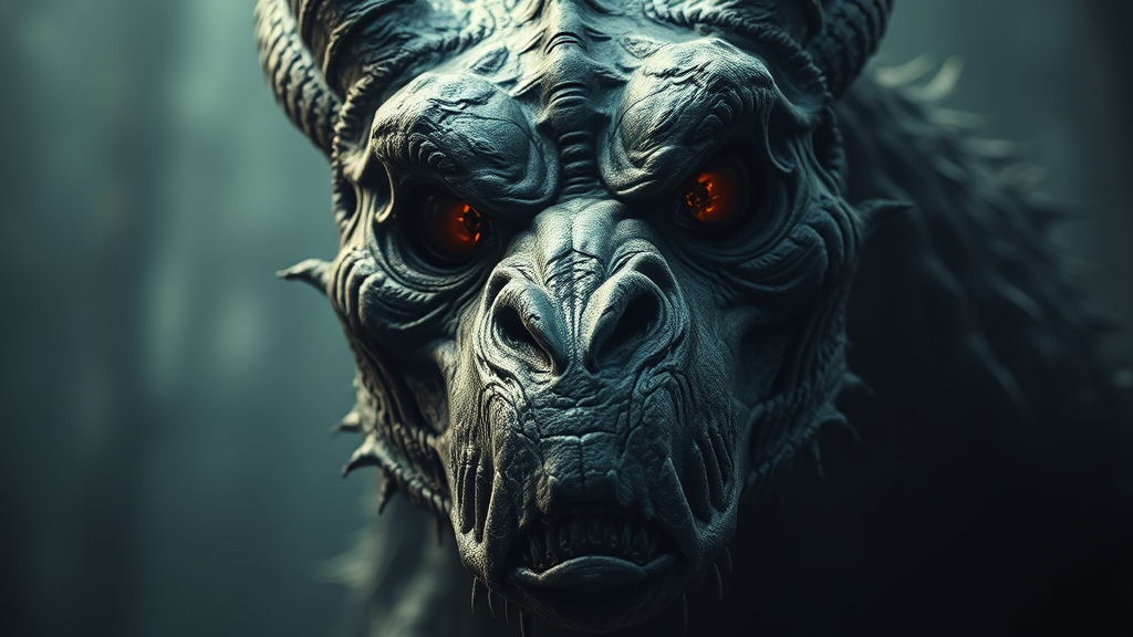 Grotesque beast, broad snout, piercing amber eyes, eerie atmosphere, shadowy and chilling, hyperrealistic depiction, intricately detailed, 8k resolution, tall and elongated form, haunting presence, unsettling realism, uncanny valley effect, dark lore ambiance, menacing aura.