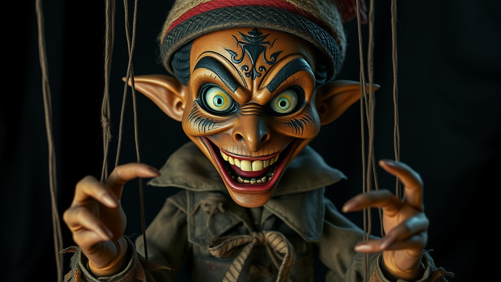 Grotesque, sinister marionette Pinocchio, with a malevolent grin, lifelike wooden features twisted into a nightmarish visage, wearing tattered marionette attire, glinting eyes filled with malice, set in a dark and shadowy D&D fantasy realm, intricate wood grain detail, sinister strings dangling ominously, elongated limbs and fingers poised menacingly, atmospheric aura exuding eerie enchantment.
