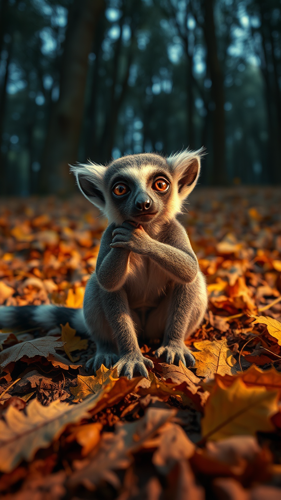 ground level perspective of a peculiar and whimsical lemur in a fall setting, highly detailed artwork with intricate textures, featuring a cool color palette reminiscent of H. R. Giger's surreal themes and the enigmatic style of Raynald Leclerc, realistic HD rendering in 8K resolution, captivating and atmospheric with an artful blend of mystery and charm amidst a tapestry of autumn leaves and ethereal lighting.