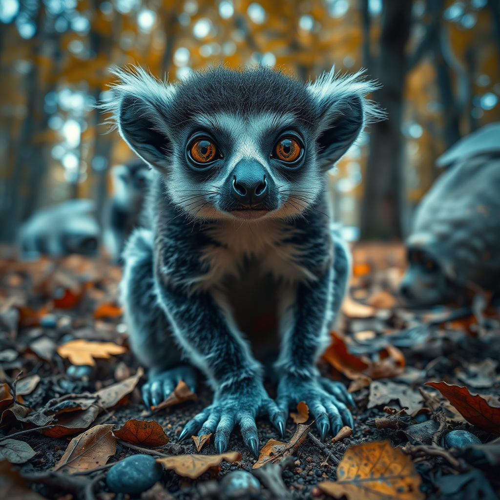 ground level perspective of a whimsical lemur in an autumn setting, featuring intricate details, with a palette of cool blues and grays, artistic influence of H. R. Giger and Raynald Leclerc, ultra-high-definition rendering, 8K quality, showcasing surreal textures and enigmatic atmosphere, subtle play of shadows and highlights creating a captivating composition.