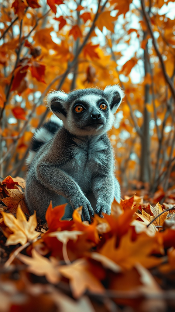 Ground level shot of a whimsical lemur amidst a fall setting, with intricate and overdetailed textures. The scene is immersed in cold colors, merging the surreal and biomechanical artistic essence of H. R. Giger with the vibrant landscapes synonymous with Raynald Leclerc. Rendered in ultra-high definition, 8K resolution, the composition captures an otherworldly yet serene atmosphere, with the lemur exuding a sense of curiosity and playful intelligence amid the autumn leaves.