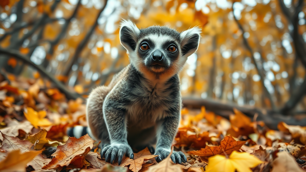 Ground level shot of a whimsical lemur in an autumn setting, featuring intricate details and a palette of cold, muted colors. The scene is inspired by the surreal, biomechanical style of H.R. Giger combined with the vivid, expressive brushstrokes of Raynald Leclerc. The background captures the essence of fall with fallen leaves, highlighting the lemur’s curious expression. The composition is rendered in HD, 8K quality, blending elements of fantasy with hyper-realism, emitting a dreamlike atmosphere.