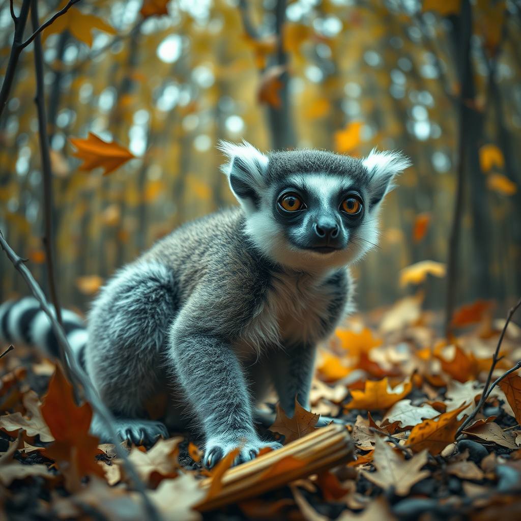 ground level shot of a whimsical lemur in autumn, intricate details, cool and muted color palette, art style blending H. R. Giger's surrealism and Raynald Leclerc's impressionism, high definition 8K resolution, nuanced textures, otherworldly atmosphere, subtle negative space effects, hint of mystery and whimsy