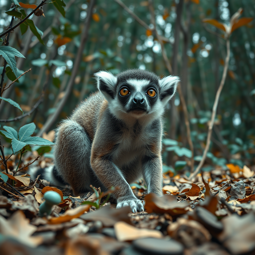 Ground level shot of an unusual Lemur in a fall setting, intricate details with emphasis on cold colors, art style inspired by H. R. Giger's biomechanical aesthetic and Raynald Leclerc’s vivid expressionism, high definition, 8K resolution, subtle hints of surrealism mingling with a dreamlike atmosphere, with rich foliage in muted teal and deep indigo hues, showcasing the lemur’s unique features and textures in an otherworldly yet familiar landscape.