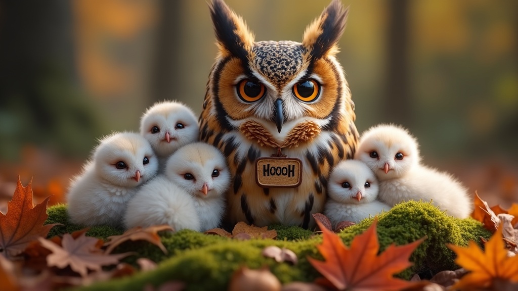 A large, brown Great Horned Owl with a 'HOOOH' tag is surrounded by four adorable white Barn Owl chicks in a cozy forest setting. The scene is nestled among vibrant autumn leaves and green moss, illuminated by soft, natural daylight, creating an endearing and humorous mood.