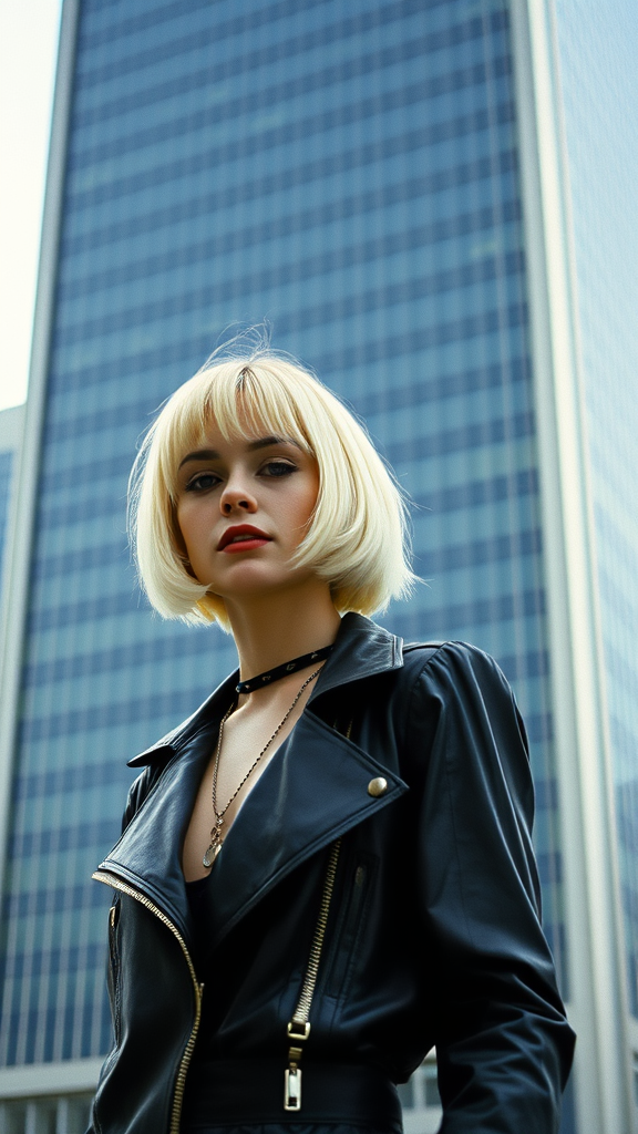 Grunge fashion scene of a woman with a 90s bob haircut and platinum blonde hair, exuding the edgy style of Manhattan in 1990. She stands confidently in front of a sleek silver high-rise building, capturing the essence of Carly Norris from the film Sliver. The photograph is taken in genuine, unobtrusive natural light, reminiscent of shots captured on Agfa Vista 200 film. The urban setting, combined with her distinctive style, perfectly encapsulates the gritty allure of the era.