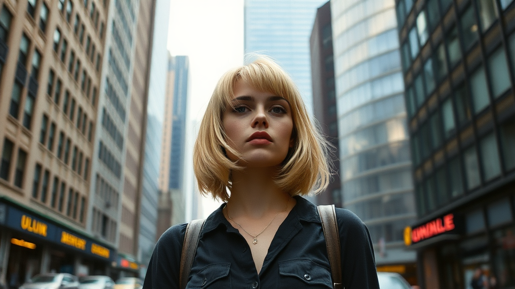 Grunge style woman with a 90s bob haircut stands on a bustling Manhattan street, the towering silver skyscraper reflecting the vibrant energy of 1990. Her blonde hair catches the natural light, reminiscent of Carly Norris from the movie Sliver. The scene captures the essence of the era with a slight artistic twist, shot on Agfa Vista 200 film for an authentic BadDream aesthetic.