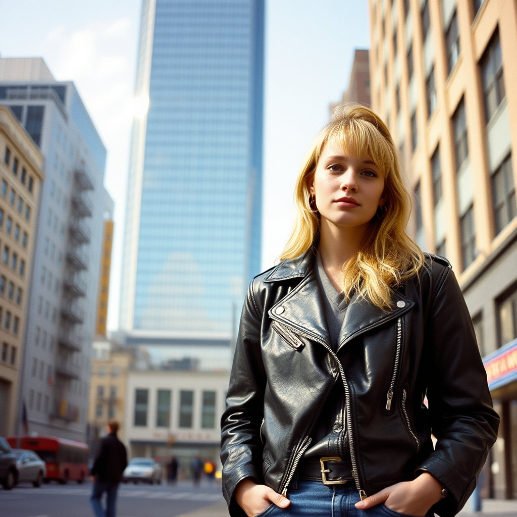 Grunge-style woman with blonde hair in a vintage leather jacket, reminiscent of Carly Norris from Sliver, stands on a bustling 1990 Manhattan street. She's posed effortlessly in front of a gleaming modern skyscraper. Captured in natural lighting on Agfa Vista 200 film, the photo features a dreamy bokeh effect with an aperture of f/1.8, evoking a nostalgic yet edgy urban vibe.