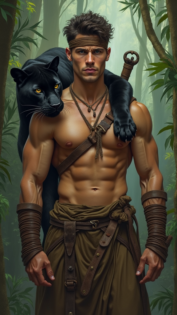 Guardian of the rainforest, protector of the jungle. Hypermasculine male, manly. Caucasian man, dark brown hair short on sides longer on top {{{short hair}}}. A brown leather band tied around his forehead. Tanned skin, smooth and hairless. Pale grey eyes with intense spiritual gaze. Strong brow and chiseled strong jaw, handsome, rugged looks. Soul patch on face. Tall, strong, muscular, sinewy, well defined, broad shoulders, broad chest, wide back. Olympian gymnast build/body. Gold necklace/talisman with leather strap around the neck. Wrapped brown leather bands around wrists, bands around tops of biceps, accenting big arms. Brown o-ring harness on the chest, strapped from the shoulder. Brown leather loincloth, barely covering the crotch area, exposing strong powerful legs. Soft, brown cloth knee-high boots wrapped around legs. Full body pose. He wields a unique bastard sword that he straps to his back. He keeps company with a huge, sleek black panther. ((MASTERPIECE))