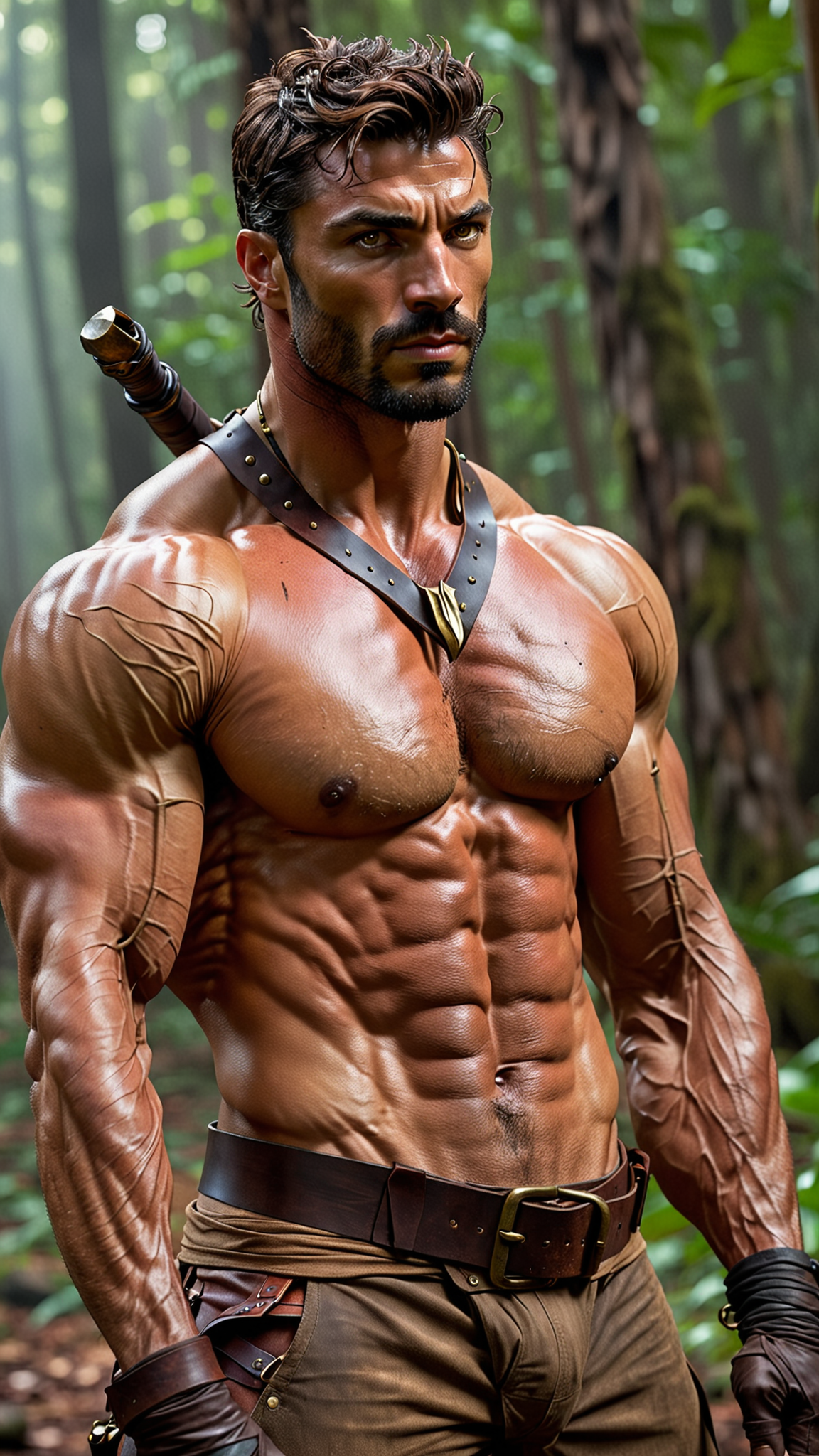 Guardian of the rainforest, protector of the jungle. Hypermasculine male, manly. Caucasian man, dark brown hair short on sides longer on top {{{short hair}}}. A brown leather band tied around his forehead. Tanned skin, smooth and hairless. Pale grey eyes with intense spiritual gaze. Strong brow and chiseled strong jaw, handsome, rugged looks. Soul patch on face. Tall, strong, muscular, sinewy, well defined, broad shoulders, broad chest, wide back. Olympian gymnast build/body. Gold necklace/talisman with leather strap around the neck. Wrapped brown leather bands around wrists, bands around tops of biceps, accenting big arms. Brown o-ring harness on the chest, strapped from the shoulder. Brown leather loincloth, barely covering the crotch area, exposing strong powerful legs. Soft, brown cloth knee-high boots wrapped around legs. Full body pose. He wields a unique bastard sword that he straps to his back. He keeps company with a huge, sleek black panther. ((MASTERPIECE))