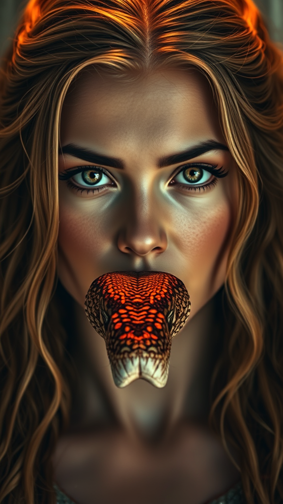 Guerrera divina con rostro angelical, su cabello parece una llama ardiente. De sus labios abiertos, surge una impresionante serpiente. Sus ojos grandes y expresivos enmarcan un retrato de cuerpo completo, destacando su piel clara y tersa. La fotografía captura una atmósfera mágica con iluminación dramática y realismo impresionante, empleando una composición íntima y cinematográfica, con un tono suave y sin fuerte contraste.