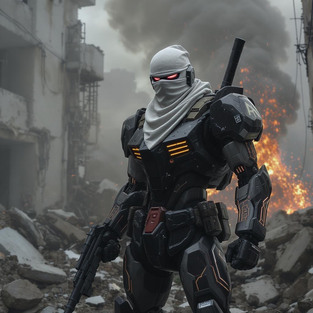 Gundam counter-terrorist character inspired by Counter-Strike, featuring a face covered with a white sheet with eye holes, set in a war-torn background with dynamic explosions. The scene captures a cinematic essence, showcasing the iconic design elements of the RX-78, with slight futuristic enhancements for originality, all while maintaining a realistic aesthetic in a high-tension battlefield environment.