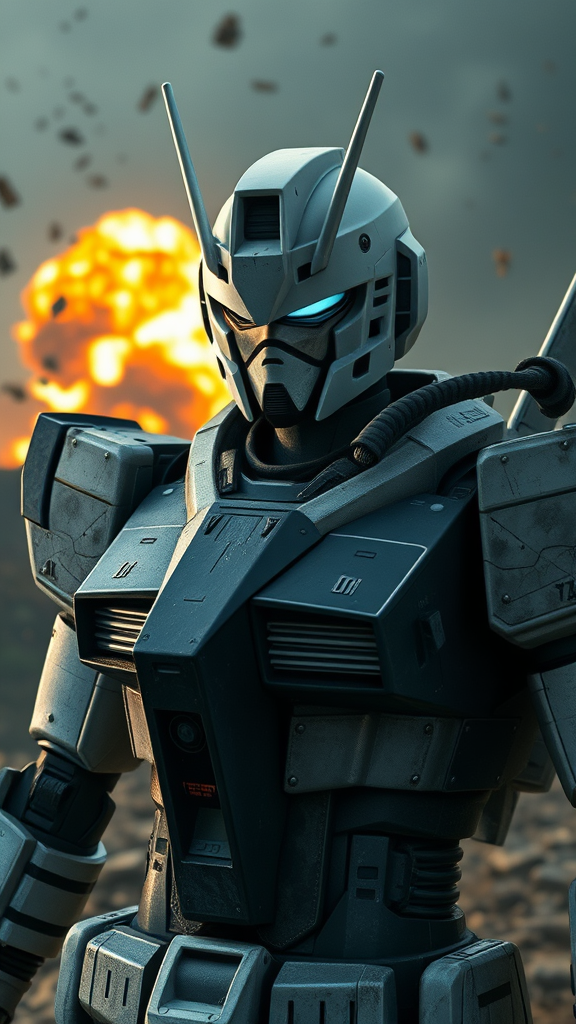 Gundam-inspired counter-terrorist from a video game stands with a face covered by a sleek white mask, featuring eye slits, in a gritty, realistic warzone backdrop. Explosions light up the distance as debris fills the air, captured in a dynamic cinematic shot. The figure resembles the iconic RX-78 mech, offering a sci-fi twist with reinforced armor and advanced weaponry, maintaining the intensity and urgency of the environment.