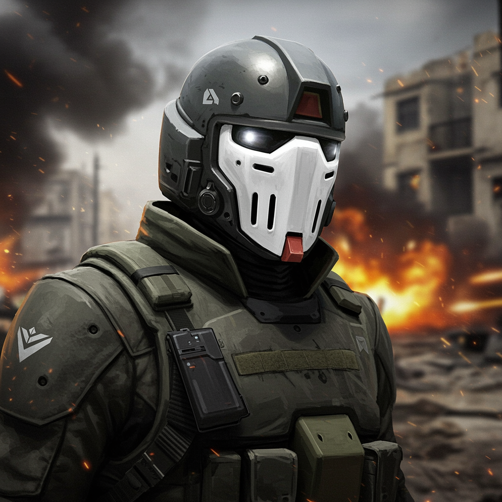 Gundam-inspired counter-terrorist from the video game Counter-Strike, wearing a high-tech helmet with a sleek white visor resembling a stylized sheet with eye slits, standing in a war-torn zone. The background features dynamic explosions and debris, capturing a cinematic battle scene. The character showcases elements of the iconic RX-78 Gundam design, with futuristic armor and a tactical edge that merges the worlds of mecha and modern combat.
