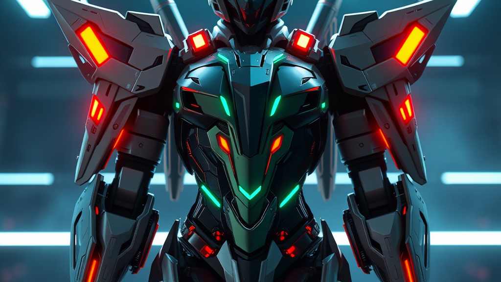 Gundam-inspired mecha armor with glowing accents envelops a futuristic bodysuit, set against dramatic lighting. This high-detail RAW color photo exudes realism with ultra-high-resolution, 8K CG unified wallpapers. Featuring physics-based rendering, the scene captures hyperrealism with rich colors and lifelike textures, reminiscent of cinematic quality film. The design showcases intricate details and a hyper-realistic aesthetic, blending seamlessly with vibrant sci-fi elements.