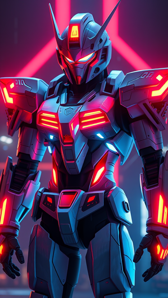 Gundam-inspired mecha suit with glowing neon accents, futuristic bodysuit design, dramatic and dynamic lighting, high detail RAW color rendering, hyper-realistic and lifelike textures, ultra high resolution 8K quality, rich and vibrant colors, physics-based rendering, hyperrealism, cinematic composition reminiscent of Cinestill 800 film, unified and immersive visual experience.