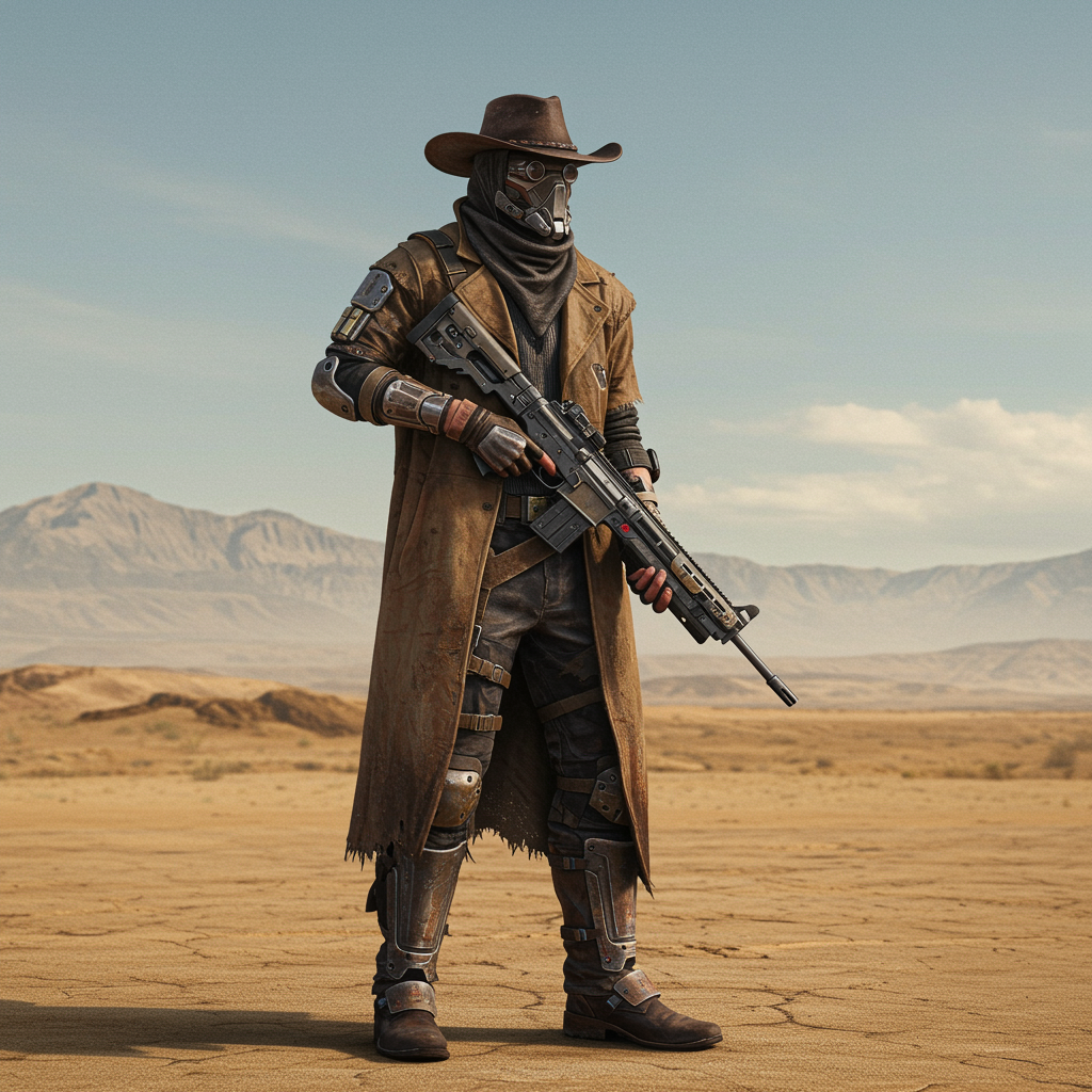 A lone gunslinger traverses a vast, futuristic post-apocalyptic desert landscape, embodying the spirit of a modern-day cowboy. Clad in rugged, weathered attire that blends rustic charm with advanced technology, he stands against the desolate backdrop, his figure a solitary silhouette under an expansive sky. The wide-angle view captures the endless horizon, emphasizing the harsh beauty of the barren terrain. In his hands, he wields a high-tech rifle, its sleek design a stark contrast to the timeless desert around him. The scene is captured in cinematic detail, with high dynamic range bringing out the vivid textures of his gear and the striking detail of the environment, rendered in crisp 8k resolution.