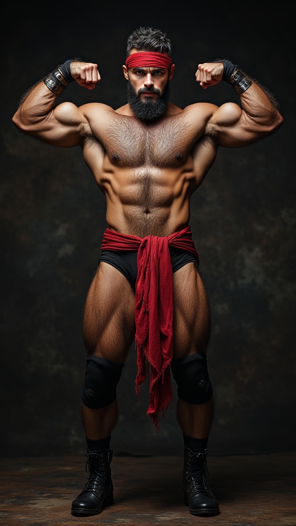 Gypsy male, mystic, wrestler, hypermasculine, bodybuilder, perfect physique, perfect body. Olive skin, hirsute body, hairy chest and abs. Sparkling pale hazel eyes. Strong brow, chiseled jaw, sexy, handsome young face, SHORT jet-black hair, scarlet red bandana tied around forehead, black goatee on face. Broad chest, wide back and shoulders, narrow waist. Extreme hair on chest, torso and arms. Strong brawny muscular sinewy body, SHIRTLESS. Extreme armpit hair, black leather boots, scarlet red sash belt, black wrestlers tights, leather bracers on arms. Full body pose, arms up, flexing biceps.