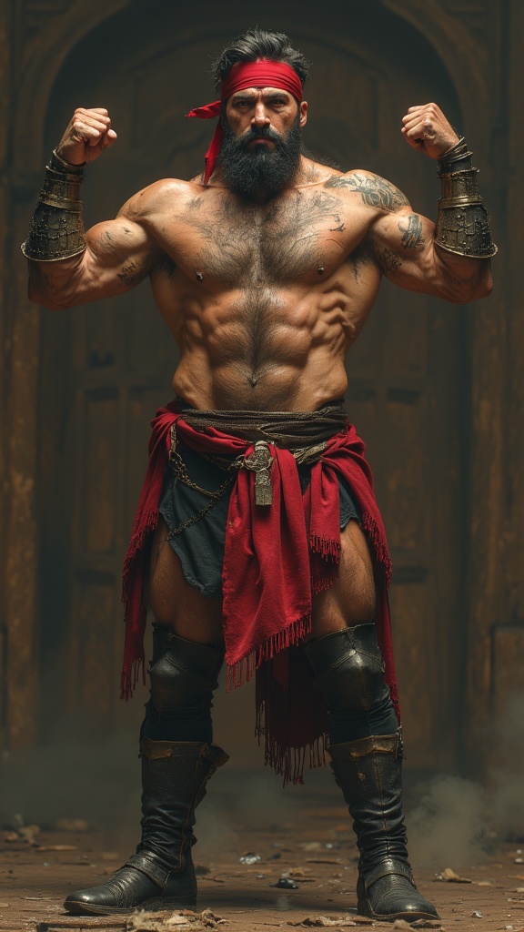 Gypsy male, mystic, wrestler, hypermasculine, bodybuilder, perfect physique, perfect body. Olive skin, hirsute body, hairy chest and abs. Sparkling pale hazel eyes. Strong brow, chiseled jaw, sexy, handsome young face, SHORT jet-black hair, scarlet red bandana tied around forehead, thin black mustache and soul-patch on face. Broad chest, wide back and shoulders, narrow waist. Extreme hair on chest, torso and arms. Strong brawny muscular sinewy body, SHIRTLESS. Extreme armpit hair, black leather boots, scarlet red sash belt, black wrestlers tights, leather bracers on arms. Full body pose, arms up, flexing biceps.