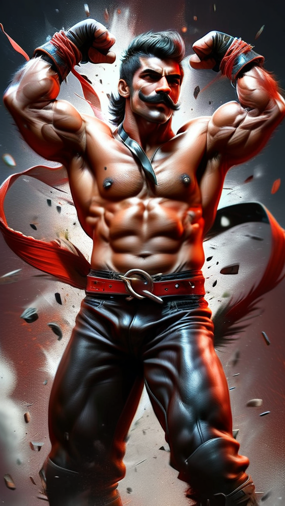 Gypsy male, mystic, wrestler, hypermasculine, bodybuilder, perfect physique, perfect body. Olive skin, hirsute body, hairy chest and abs. Sparkling pale hazel eyes. Strong brow, chiseled jaw, sexy, handsome young face, SHORT jet-black hair, scarlet red bandana tied around forehead, thin black mustache and soul-patch on face. Broad chest, wide back and shoulders, narrow waist. Extreme hair on chest, torso and arms. Strong brawny muscular sinewy body, extreme armpit hair. SHIRTLESS. SWEATY. Black leather boots, scarlet red sash belt, black wrestlers tights, leather bracers on arms. Full body pose, arms up, flexing biceps.