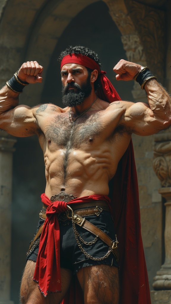 Gypsy male, mystic, wrestler, hypermasculine, bodybuilder, perfect physique, perfect body. Olive skin, hirsute body, hairy chest and abs. Sparkling pale hazel eyes. Strong brow, chiseled jaw, sexy, handsome young face, SHORT jet-black hair, scarlet red bandana tied around forehead, thin black chevron mustache on face. Broad chest, wide back and shoulders, narrow waist. Extreme hair on chest, torso and arms. Strong brawny muscular sinewy body, SHIRTLESS. Sweaty, extreme armpit hair, black leather boots, scarlet red sash belt. Form-fitting black wrestlers tights, leather bracers on arms. Full body pose, arms up flexing biceps.