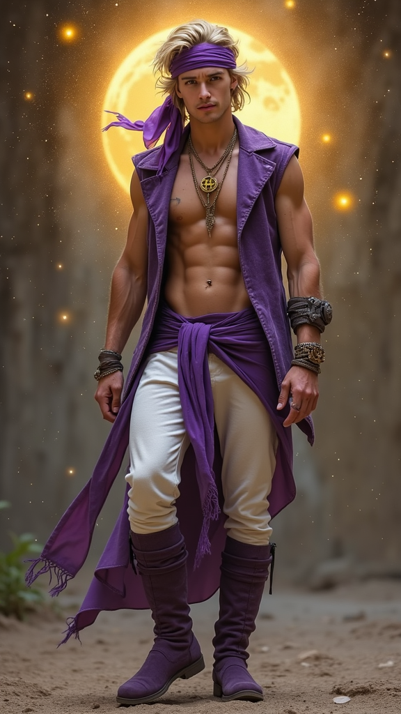 Gypsy, mystic, magical, walker between-the-worlds. Masculine male, late twenties. Medium length sandy blonde hair, purple scarf tied around forehead. Pale hazel eyes, intense gaze. Strong brow and chin, handsome, model, young. Soul patch on face. Lithe but sinewy body, muscular, strong, well defined. Wide shoulders, broad chest, narrow waist. Smooth body with minimum body hair. Purple, open suede vest, exposed chest. Golden Gypsy talisman around neck. White sport tights/pants, purple sash wrapped around waist. Purple suede knee-high boots, slouchy boots. Magical golden sparkling aura. Full body pose, celestial background.