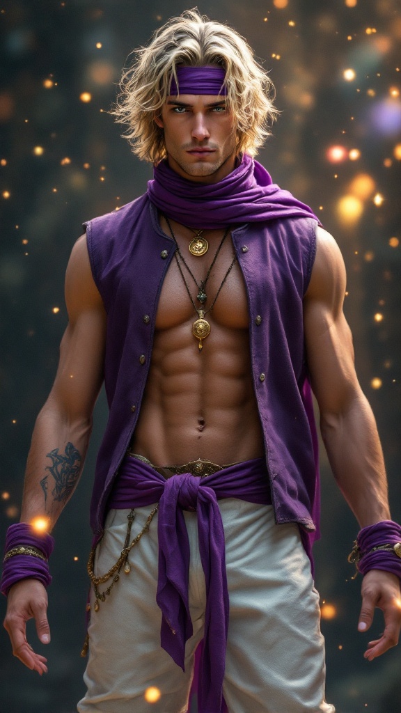 Gypsy, mystic, magical, walker between-the-worlds. Masculine male, late twenties. Medium length sandy blonde hair, purple scarf tied around forehead. Pale hazel eyes, intense gaze. Strong brow and chin, handsome, model, young. Soul patch on face. Lithe but sinewy body, muscular, strong, well defined. Wide shoulders, broad chest, narrow waist. Smooth body with minimum body hair. Purple, open suede vest, exposed chest. Golden Gypsy talisman around neck. White sport tights/pants, purple sash wrapped around waist. Purple suede knee-high boots, slouchy boots. Magical golden sparkling aura. Full body pose, celestial background.