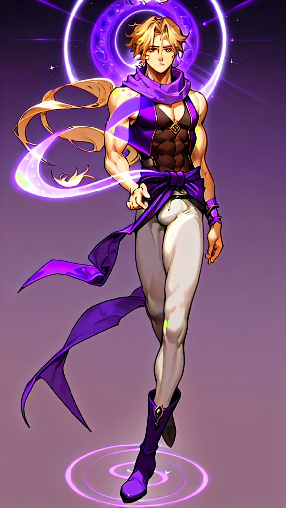Gypsy, mystic, magical, walker between-the-worlds. Masculine male, late twenties. Medium length sandy blonde hair, purple scarf tied around forehead. Pale hazel eyes, intense gaze. Strong brow and chin, handsome, model, young. Soul patch on face. Lithe but sinewy body, muscular, strong, well defined. Wide shoulders, broad chest, narrow waist. Smooth body with minimum body hair. Purple, open suede vest, exposed chest. Golden Gypsy talisman around neck. White sport tights/pants, purple sash wrapped around waist. Purple suede knee-high boots, slouchy boots. Magical golden sparkling aura. Full body pose, celestial background.