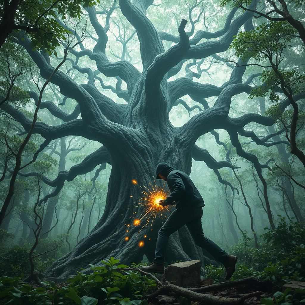 hacker battling an ancient oak in a digital forest, infused with code and nature elements, chaotic yet harmonious