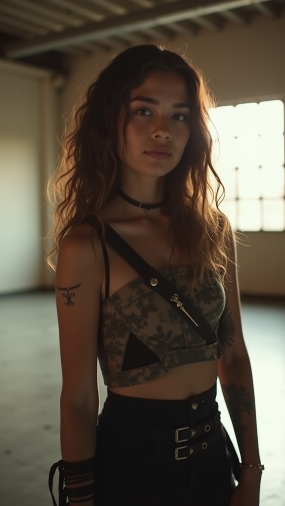 An 18-year-old with wavy hair stands in a spacious, open room, bathed in soft side lighting that highlights her features. She wears a subtle smile, embodying a sense of shy confidence. Clad in a unique, bold outfit with hints of edgy fashion, she gazes thoughtfully into the distance. The scene is captured with a sense of intimacy and curiosity, emphasizing the blend of vulnerability and strength in her presence.