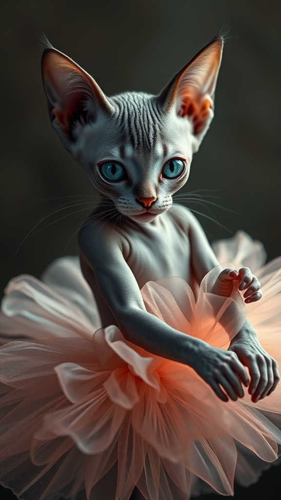 Hairless feline ballet dancer adorned in a flowing tutu, featuring captivating and perfect eyes, rendered in hyperrealistic 8k photorealism, masterfully blending dark and light elements, enhanced with artistry tools to emphasize subtle details and textures.