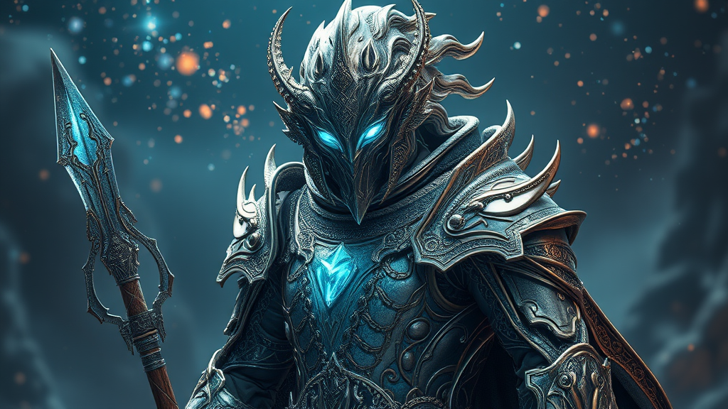 half beast half human assassin adorned in elaborate armor forged from radiant earth silver metal, the ornate and intricately detailed suit glimmers with an ethereal glow, showcasing fanciful designs and exquisite craftsmanship; set in a fantasy realm with breathtaking intricacy, capturing a supernova backdrop in stunning 8k resolution, the scene bathed in mesmerizing volumetric lighting, dimensions set to emphasize the striking presence of the figure.