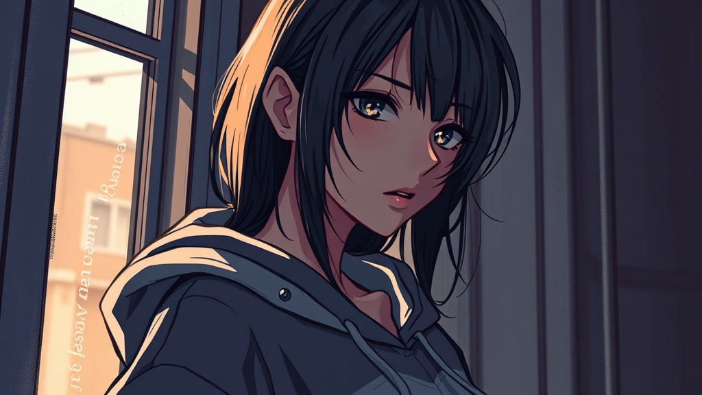 Half body portrait of a beautiful girl by a window, wearing a hoodie, featuring dynamic lighting and shadows, sultry expression, anime style fused with comic elements, intricate details, digital painting in rough, muted colors. The image has intentional imperfections like jpeg artifacts, and displays an artistic exploration with elements of low quality and distortion, challenging conventional aesthetics. The composition includes exaggerated and experimental proportions, creatively portraying features such as elongated limbs or neck, while subtly introducing abstract or surreal elements like duplicated or misplaced features. Rustic textures and hand-drawn imperfections contribute to the overall uniqueness, blending traditional and digital art influences.