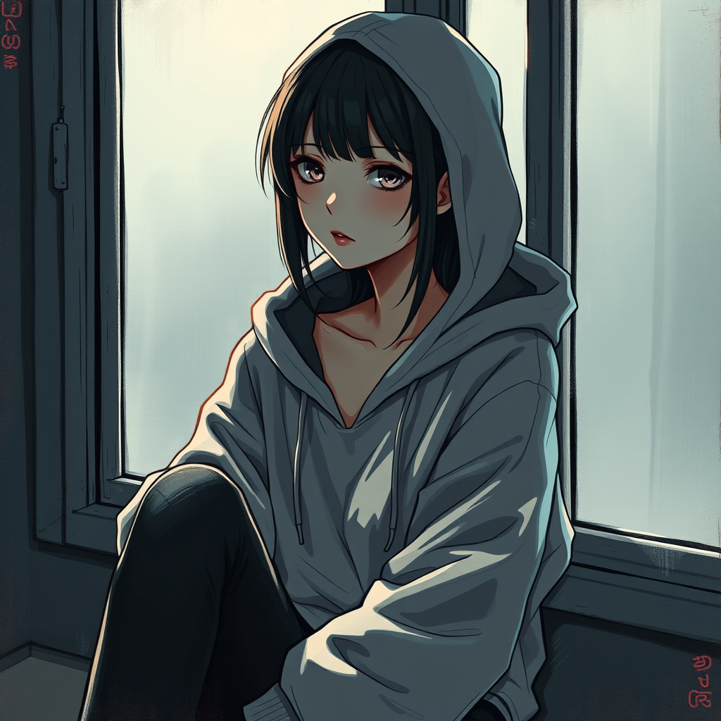 Half-body portrait of a beautiful girl sitting by the window in a cozy hoodie, anime-inspired with dynamic lighting and deep shadows. The atmosphere is sultry, with a touch of comic book style, rendered in 8k resolution. The painting features muted colors and intricate details, maintaining a rough, textured feel. Despite the deliberate inclusion of imperfections like low quality, jpeg artifacts, and challenges like poorly drawn hands and face, the piece remains captivating. It plays with proportions, offering a surreal and morbid twist with elements like extra limbs, a long neck, and distorted features, while avoiding grotesque or overly graphic depictions. The artwork includes subtle hints of text, signature-like marks, and watermark elements to mimic a vintage comic book cover vibe.