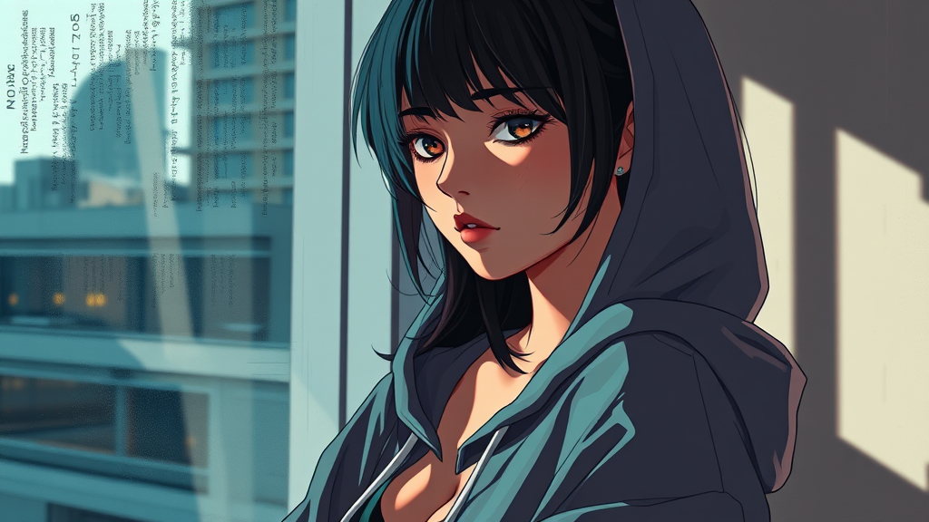 Half body portrait of a captivating girl by a window, wearing a hoodie, with dynamic lighting casting intriguing shadows, sultry anime style infused with comic elements, rendered in 8k with rough, muted colors, digital painting that is extremely intricate. Image intentionally incorporates elements like text, imperfections, jpeg artifacts, and duplicated features to mimic low quality. Features may appear exaggerated with poorly drawn hands, face mutations, blurred aspects, and unusual proportions. The figure could have extra limbs or missing parts, portraying an intentional artistic distortion. Includes stretched neck, disfigured or cloned features, and other unnatural elements. Visuals might include emblems like cameras or watermarks as part of the artistic exploration, with obstructed or altered anatomy for unique effect.